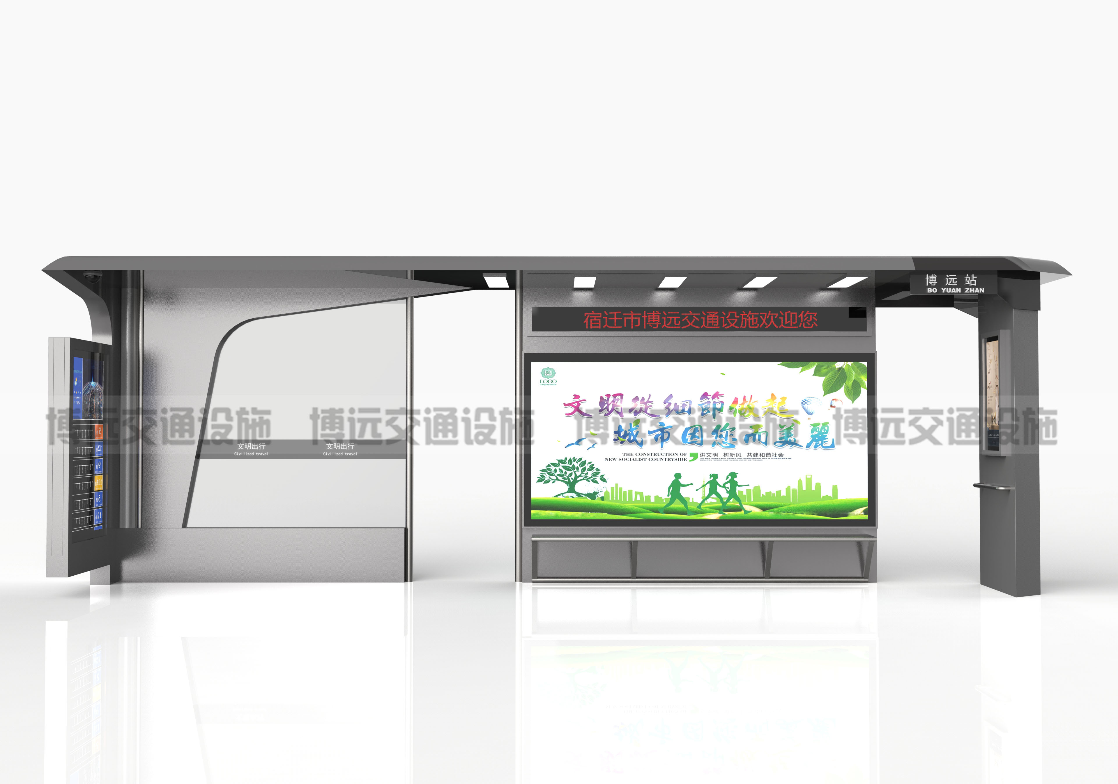 新版公交候車亭的長處:新一代公交站臺的箱體具有環(huán)保、耐高溫、彈力強、經(jīng)用、抗老化、耐壓、防涂污、韌性好、硬度高、阻燃等等特點,使用壽命長而且保護便利;新一代公交站臺不只制造精美、樣式也十分的新穎。除了智能電子屏以外,還另有兩個燈箱可放城市的公益畫布、城市地圖等,別的到晚上新一代公交站臺可主動亮起,為過往的行人供給足夠的照明。