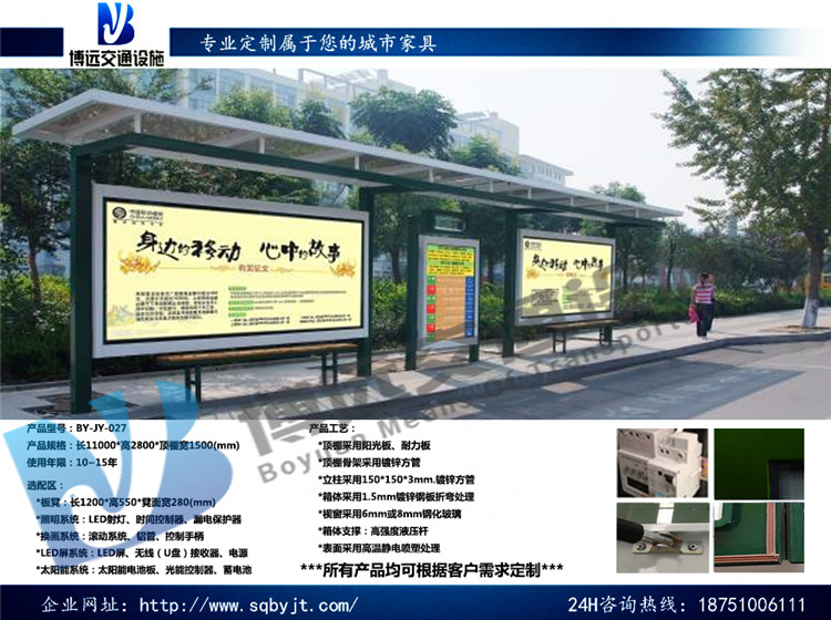 候車亭在人們?nèi)粘3俗^程中可以說是非常重要的一個(gè)公共設(shè)施了,有了候車亭的存在,人們才能更好的進(jìn)行公交車的乘坐和各種公交路線的規(guī)劃,所以說這是一個(gè)非常重要的公共設(shè)施,正是因?yàn)檫@樣,各種候車亭生產(chǎn)廠家才會(huì)發(fā)展的那么好。隨著全國(guó)大多數(shù)城市都在緊鑼密鼓的建設(shè)候車亭,作為采購(gòu)商怎樣判斷的質(zhì)量呢? 下面,宿遷市博遠(yuǎn)交通設(shè)施有限公司就教教您如何選購(gòu)優(yōu)質(zhì)的候車亭產(chǎn)品。